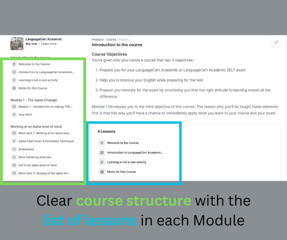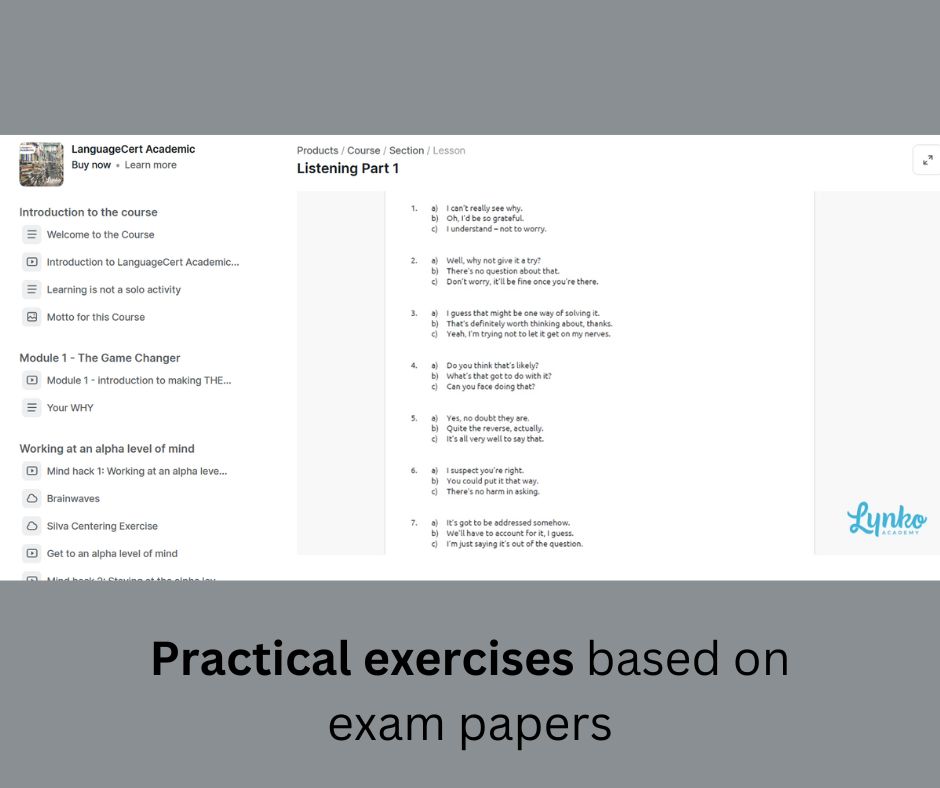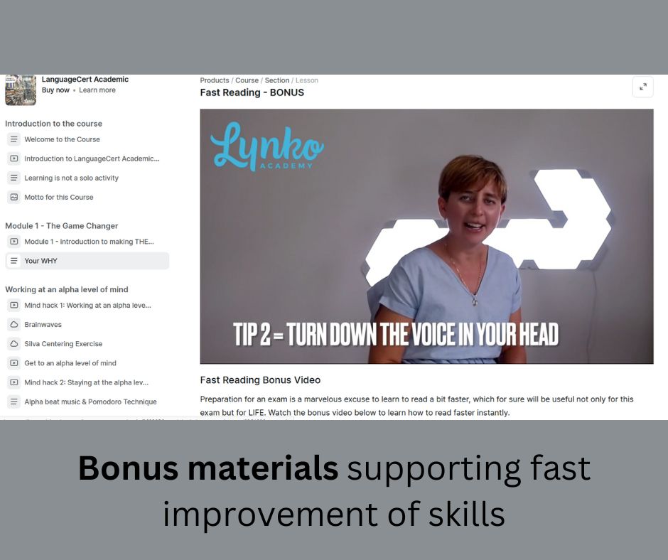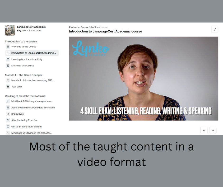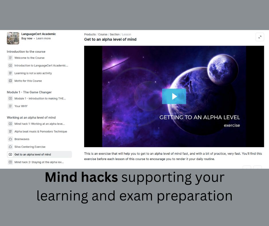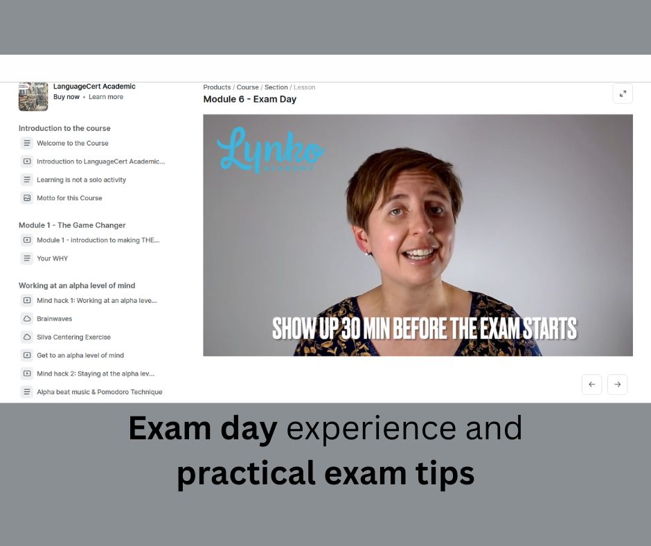 The course looks into every part, every task and every aspect of LanguageCert Academic exam, providing you with video lessons and practical exam tasks followed by feedback. It doesn't neglect your mental exam preparation, supporting it with mind hacks turned into daily practice.