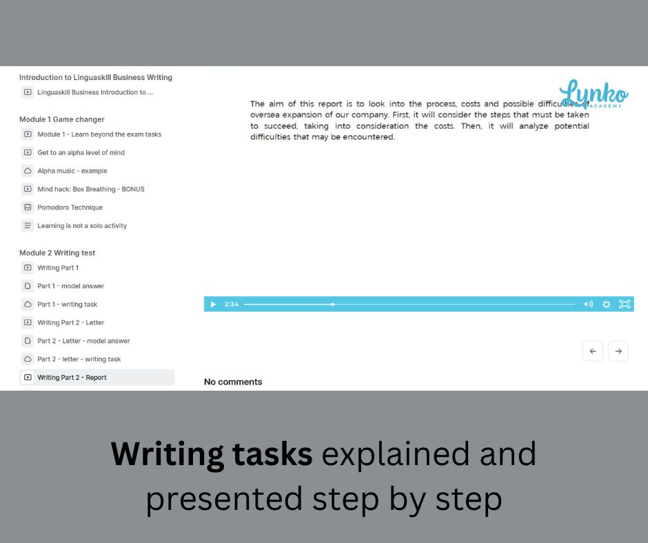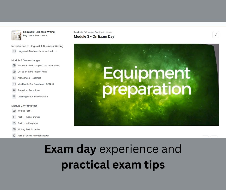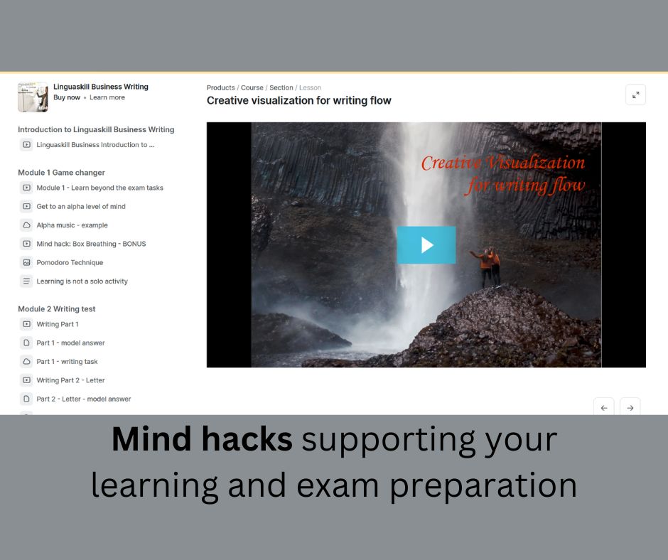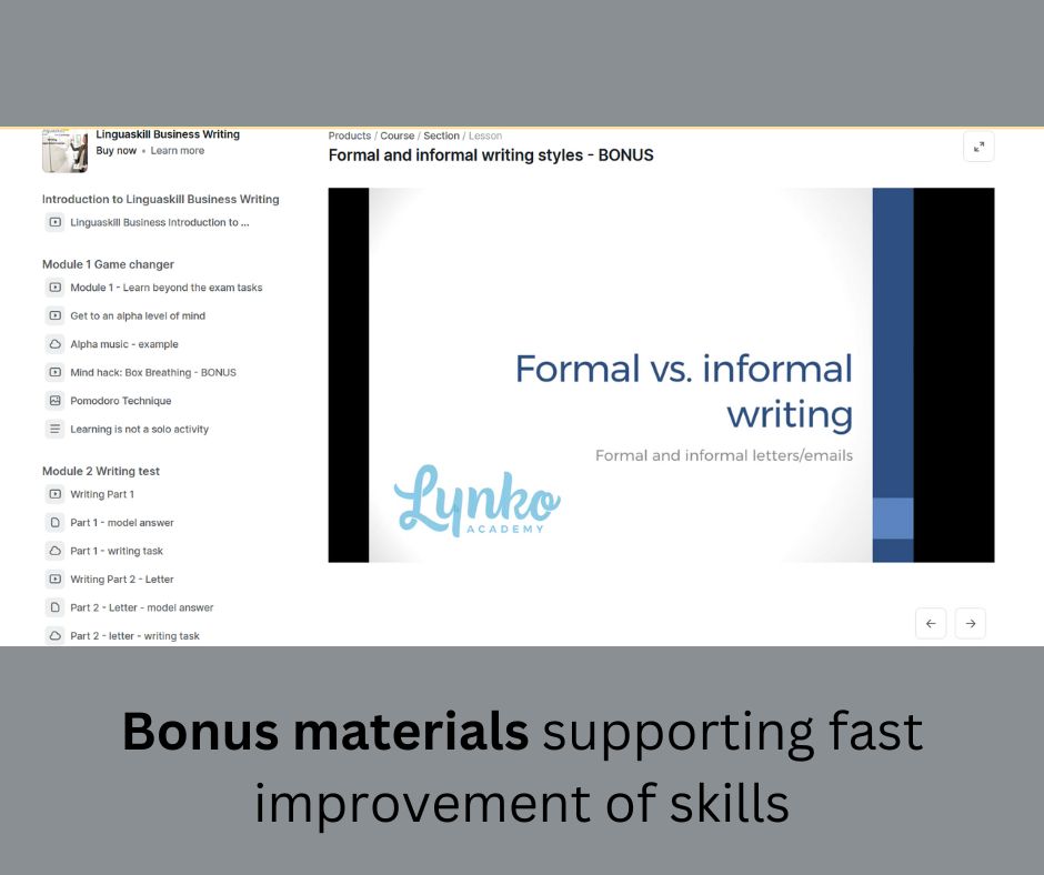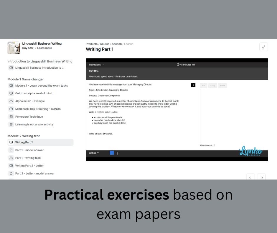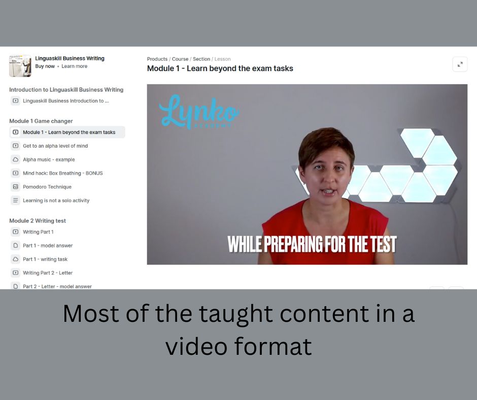 The course looks into every aspect of Linguskill Business Writing exam, providing you with video lessons and practical exam tasks followed by feedback. It doesn't neglect your mental exam preparation, supporting it with mind hacks and tips helping you to study more efficiently and, as a result, perform better in the exam.