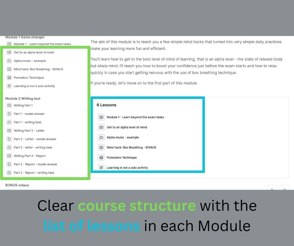 Every lesson introducing new exam parts and tasks as well as new aspects of exam preparation is in a video format - easy to watch or listen to.