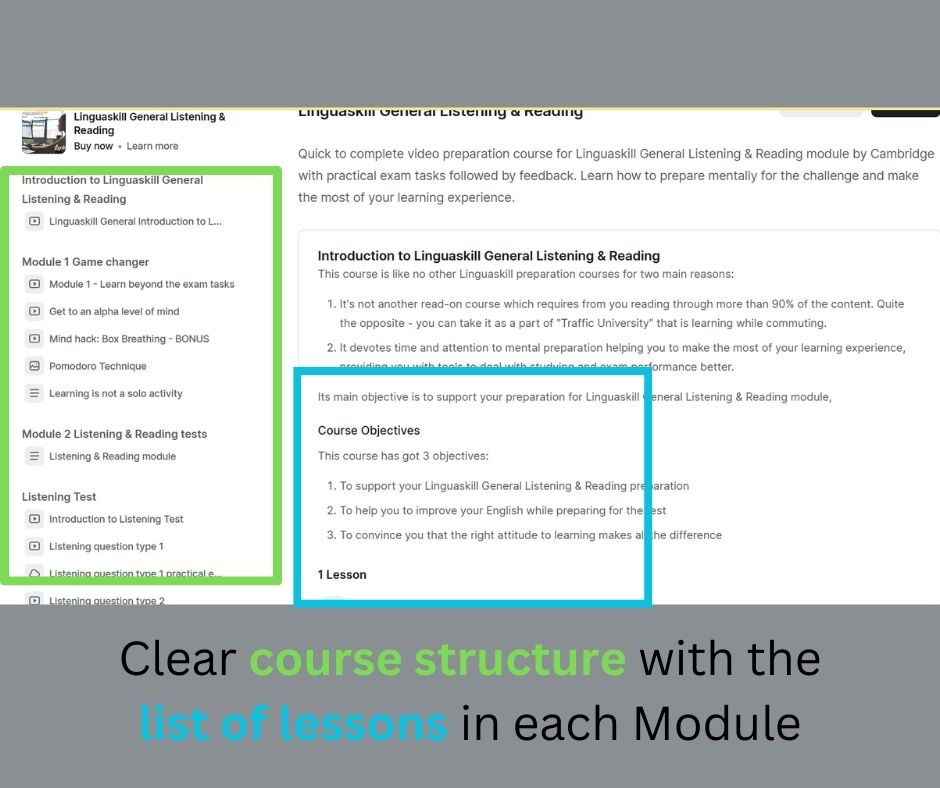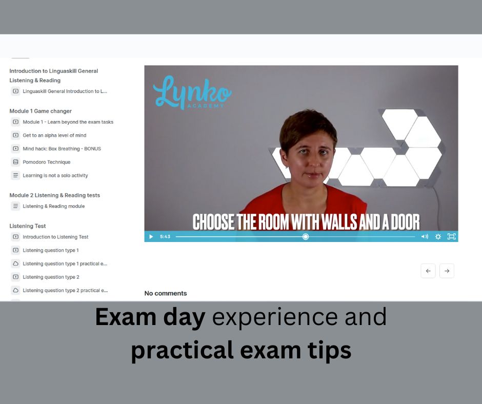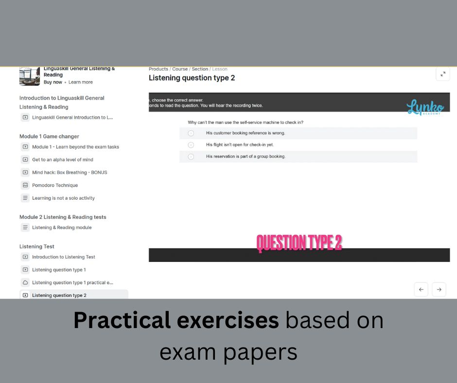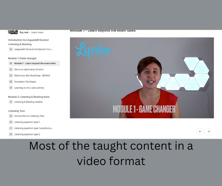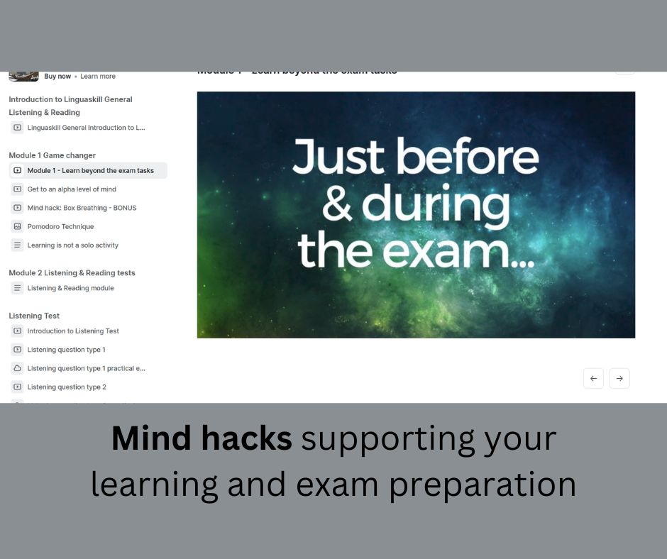 The course looks into every aspect of Linguskill General Listening & Reading exam, providing you with video lessons and practical exam tasks followed by feedback. It doesn't neglect your mental exam preparation, supporting it with mind hacks and tips helping you to study more efficiently and, as a result, perform better in the exam.