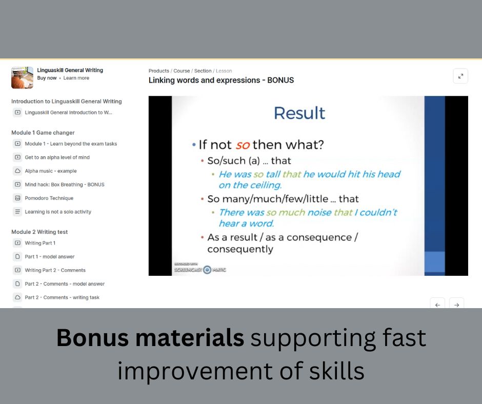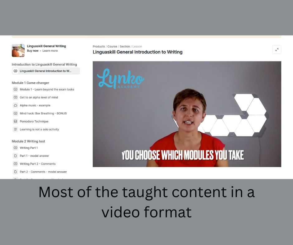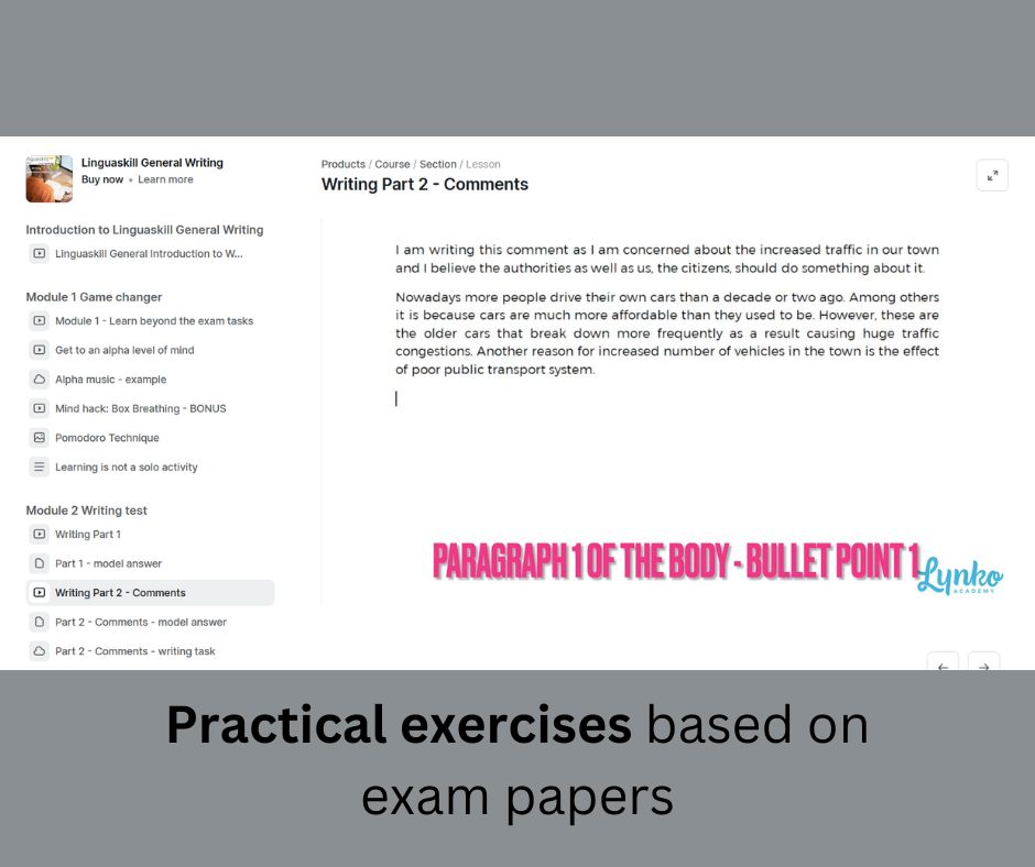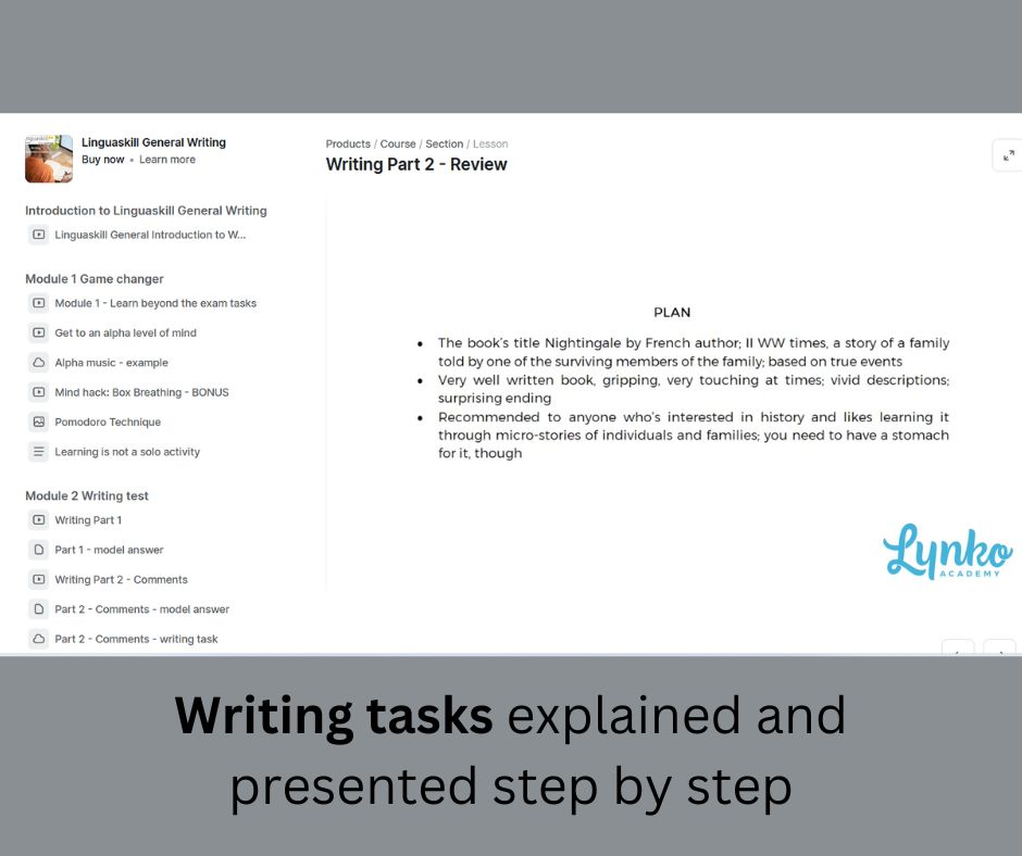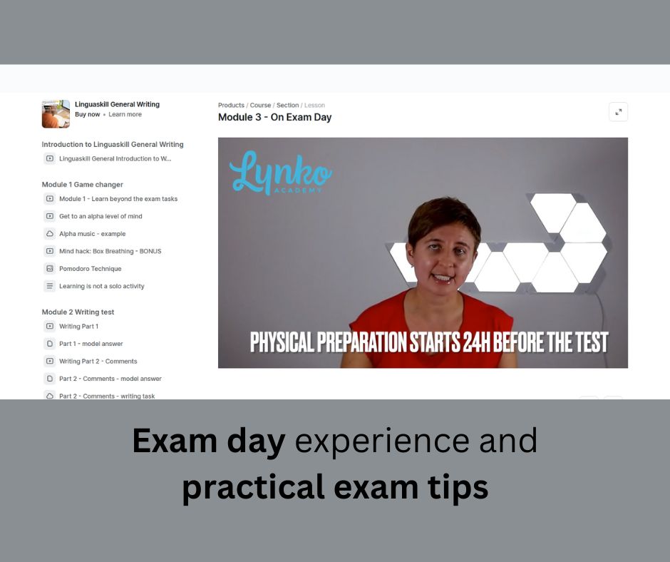 The course looks into every aspect of Linguskill General Writing exam, providing you with video lessons and practical exam tasks followed by feedback. It doesn't neglect your mental exam preparation, supporting it with mind hacks and tips helping you to study more efficiently and, as a result, perform better in the exam.